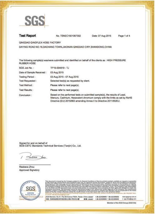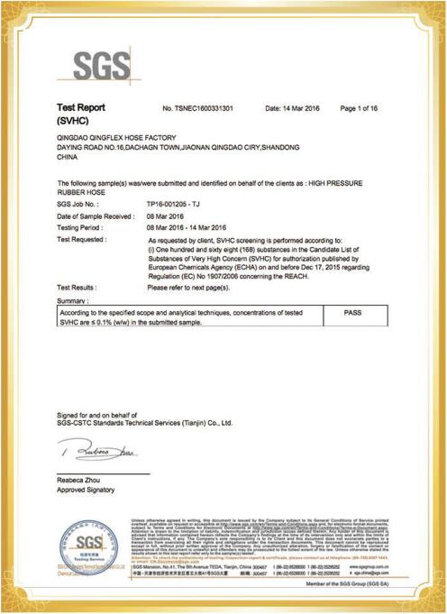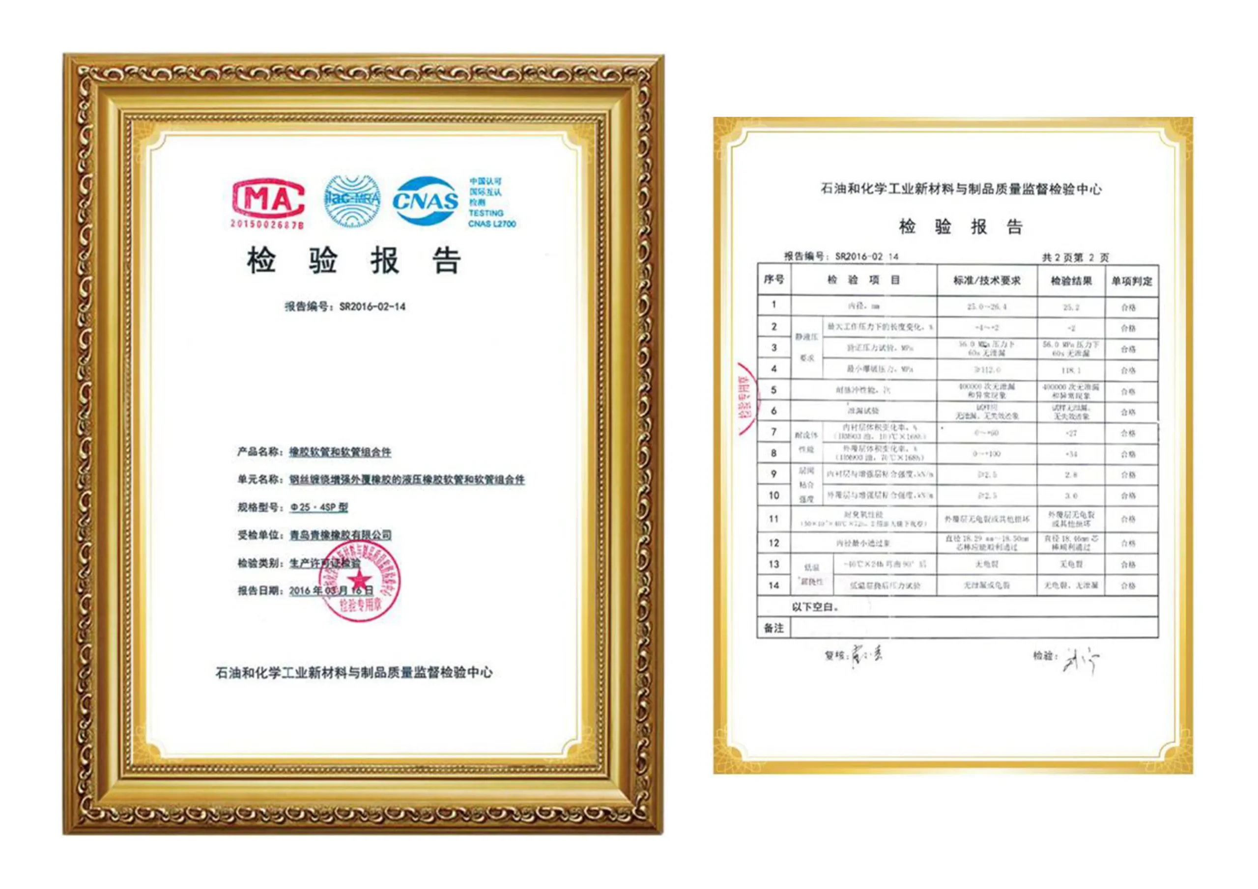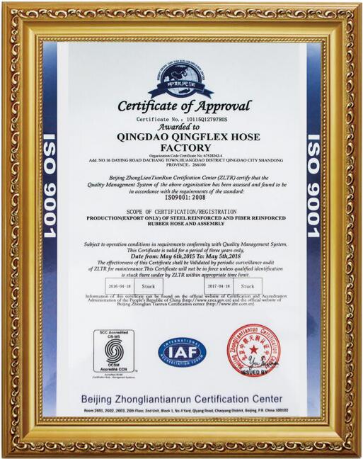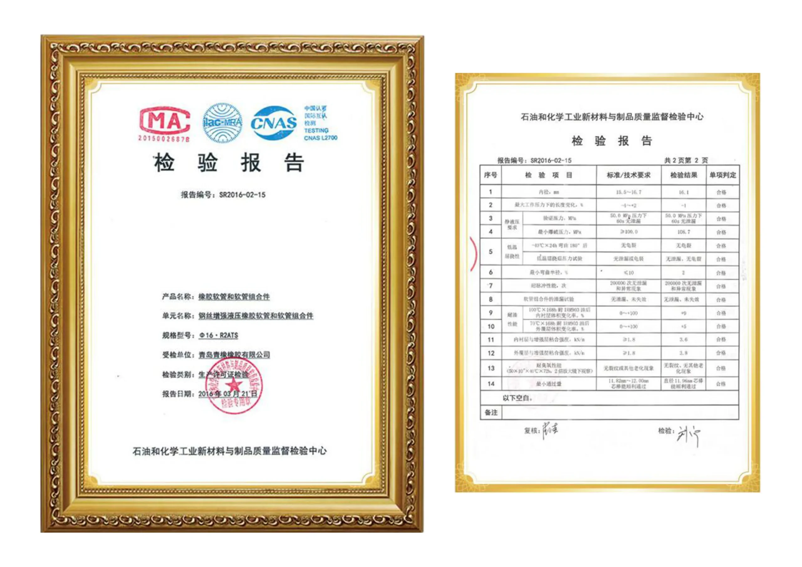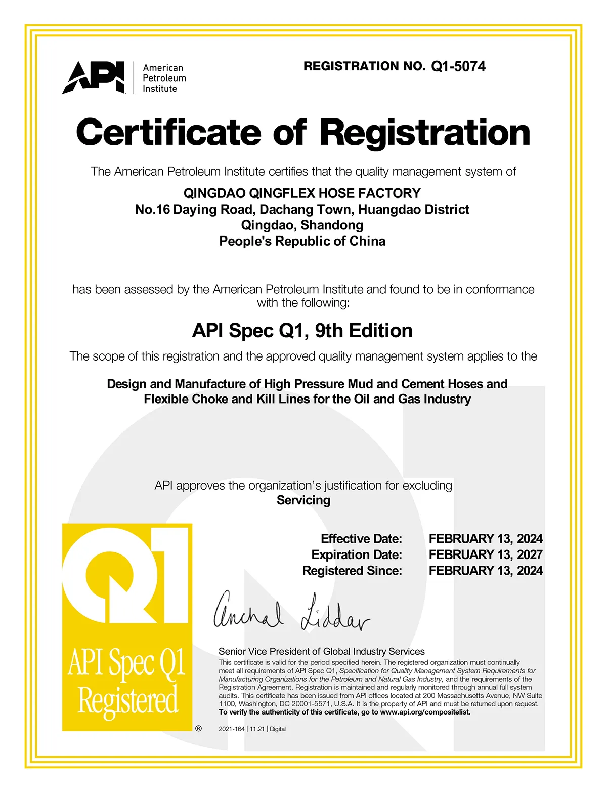 Qingdao Qingflex Hose Factory has the certificates of API 7K, API 16C, API Q1, and is one of the drafting units of Chinese acid frac hose standards